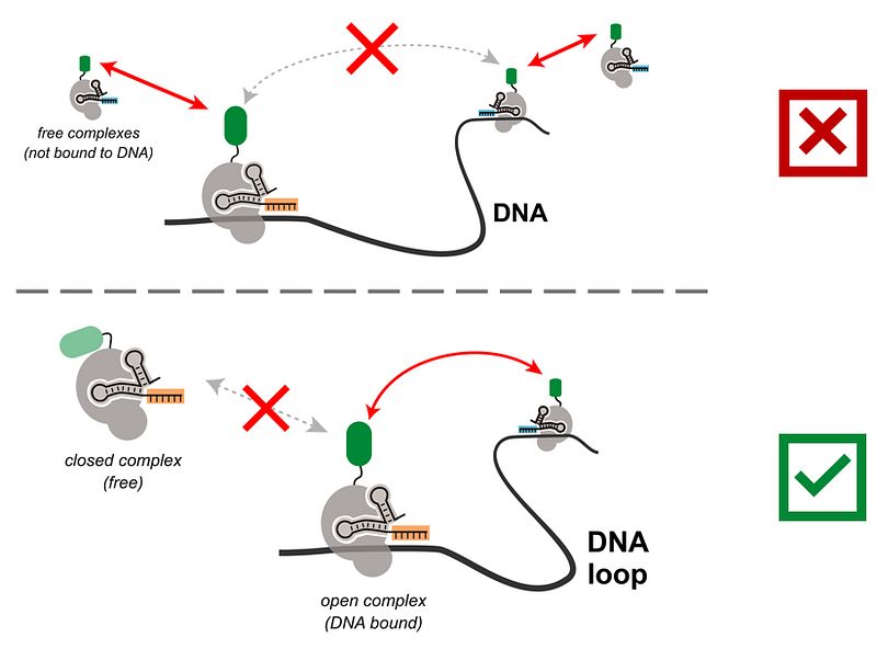 To better understand the influence of looping on gene regulation, synthetic gene looping systems have been developed (Priest 2013, Morgan 2017, Hao 2021). In these systems, a protein consisting of a DNA-binding domain and dimerization domain bind DNA and each other to bring two sections of DNA together (Figure 4, upper). However, these systems suffer from inefficient looping, particularly over longer genomic distances. A major factor contributing to this inefficiency is binding of DNA-bound complexes by free complexes, which can then weaken or block loop formation (Figure 4, upper) (Priest 2013).