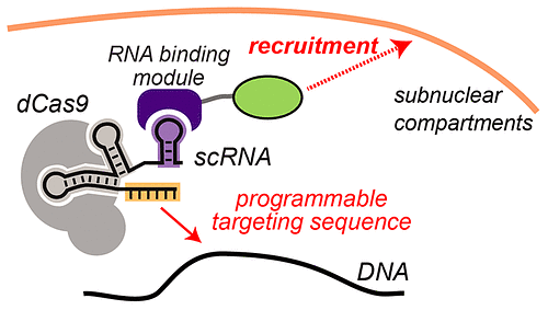 Figure 3. Genomic sites can be physically repositioned by fusing a DNA binding domain to a membrane protein. The DNA binding domain in this instance is a CRISPR-Cas complex that can be programmed to different target sites. The CRISPR-Cas complex can be linked to a membrane protein via a scaffold RNA (scRNA), a modified gRNA that includes an MS2 RNA hairpin to recruit the MS2 coat protein (MCP) (Zalatan 2015). MCP is fused to the membrane protein, thus recruiting the gene to the nuclear membrane.