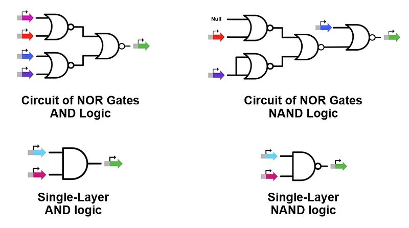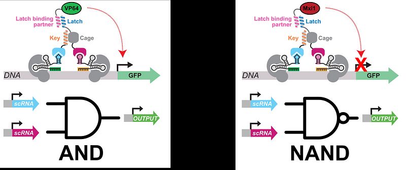 Figure 1. AND and NAND gates constructed from a circuit of NOR gates are the current standard for the formation of AND and NAND genetic logic. I have developed single-layer AND and NAND gates. This should allow for the development of more complex genetic logic systems with simplified circuits.
